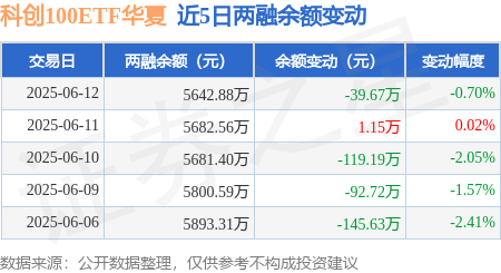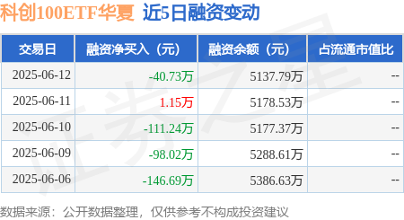 本站消息,6月12日,科创100ETF华夏(588800)融资买入125.85万元,融资偿还166.59万元,融资净卖出40.73万元,融资余额5137.79万元。